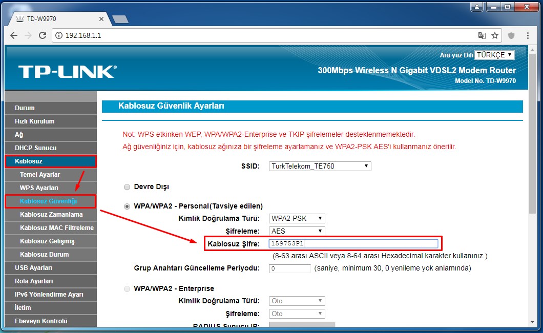 Bu yazımızda sizlere basit bir şekilde -aynı zamanda telekomunda (ttnet) vermiş olduğu- TP-Link TD-W9970v3 modemin kablosuz-wifi şifresinin nasıl değiştirileceğini anlatacağım. Bildiğiniz gibi bu cihaza ait modem girişi ve kablosuz şifreler modemin altında yer alıyor. Dilerseniz cihaza ait wifi-kablosuz şifreyi basit bir kaç adımda değiştirebilirsiniz. Şifre değiştikten sonra bu cihaza tekrar bağlanarak internete girmek için telefon, tablet, laptop gibi cihazlardan yeni şifreyi girmeniz gerekiyor.