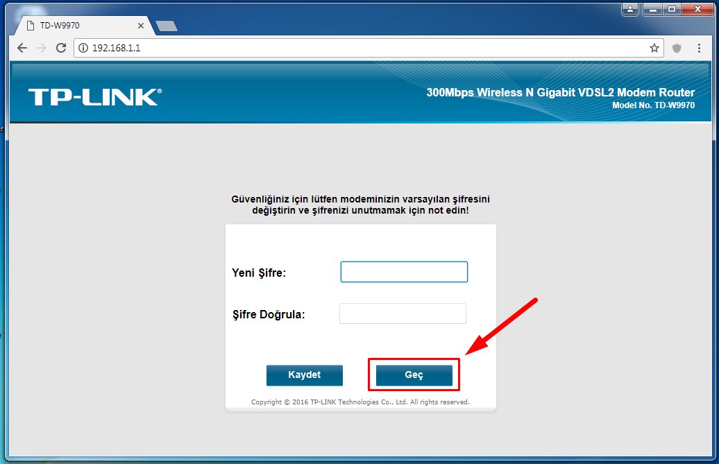 2-Adım: Bu adımda aşağıdaki gibi bir pencere çıkarsa geç deyin. bU Könceden modem şifreniz ayarlanmışsa gelmeyebilir. Dilerseniz değiştirebilirsiniz. Ama bu şifreleri unutmamanızda fayda var.