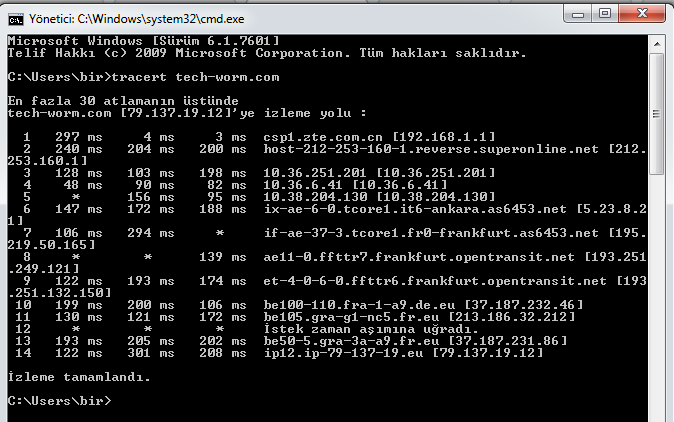 Açılan pencereye tracert tech-worm.com veya sorgulamak istediğiniz ip numarası veya web adresini yazın. Karşısına aşağıdaki gibi bilgisayarınız ile hedef gösterdiğiniz adres arasındaki ip’leri ve erişim sürelerini göreceksiniz. Aşağıda görüldüğü üzere her bir satır Hop numarasına sahiptir. Her bir hop’a üç deneme yollanır ve the round trip times (RTT) değerleri milisaniye cinsindendir.