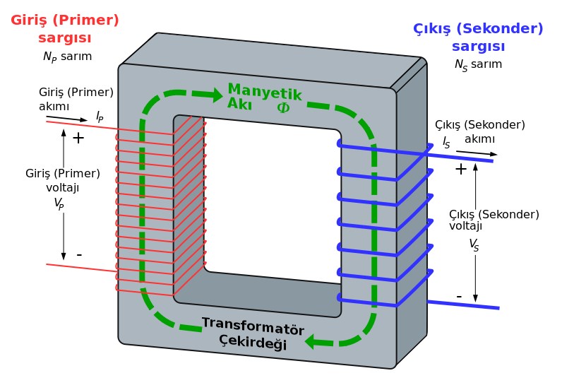 Transformatör en basit halde, birbirine yakın konan iki sargıdan ibarettir. Eğer bu iki sargı ince demir levhaların üzerine sarılmışsa buna demir çekirdekli transformatör denir. Eğer demirsiz plastik tüp gibi bir çekirdeğe sarılmışsa buna hava çekirdekli transformatör denir. Sargılardan birine voltaj uygulanırsa, diğerinde de bir voltaj meydana gelir. Voltajın tatbik edilmesiyle ortaya çıkan akım, sargı etrafında bir manyetik alan doğurur. Bu alan, yakına konan diğer sargıda bir voltaj ortaya çıkarır. Ancak manyetik alanın daima değişerek çıkış sargısındaki voltajı devam ettirmesi gerekir. Birinci bobine tatbik edilen voltaj sabit olursa, diğer bobinde herhangi bir voltaj meydana gelmez. Ancak doğru akım sürekli olarak kapatılır ve açılırsa manyetik alan değişerek bir çıkış meydana gelir. Otomobillerde bulunan radyo alıcısındaki vakum tüp bu prensiple çalışır.
