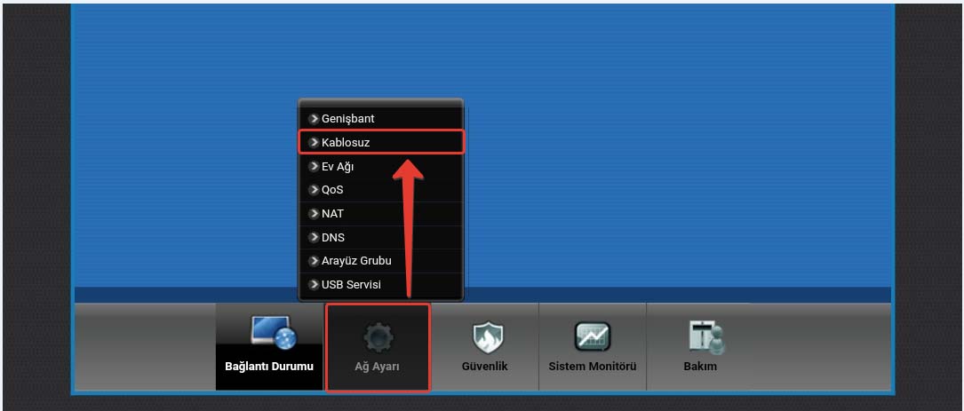 Gelen pencerede en altta bulunan “Ağ Ayarı” simgesine dokunuyoruz ve açılan küçük panelden “Kablosuz” seçeneğini seçiyoruz.