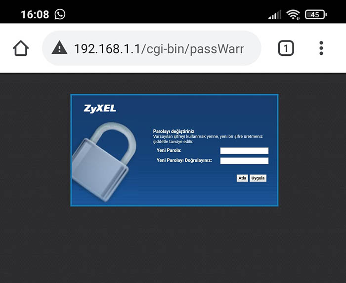 3- Bu kısımda gelen parolayı değiştiriniz ekranında herhangi bir şey girmeden atla diyelim. Bu kısım modem arayüz şifresi olduğu için değiştirmemize gerek yok.