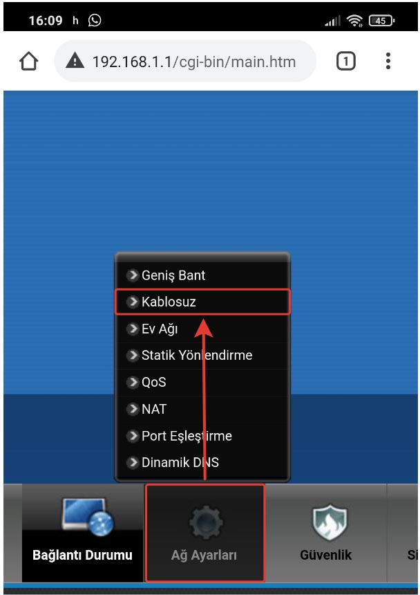 4- Karşımıza gelen sayfada alt kısımda bulunan “Ağ Ayarları” kısmına tıklayın ve açılan panelde “Kablosuz” sekmesini tıklayın.