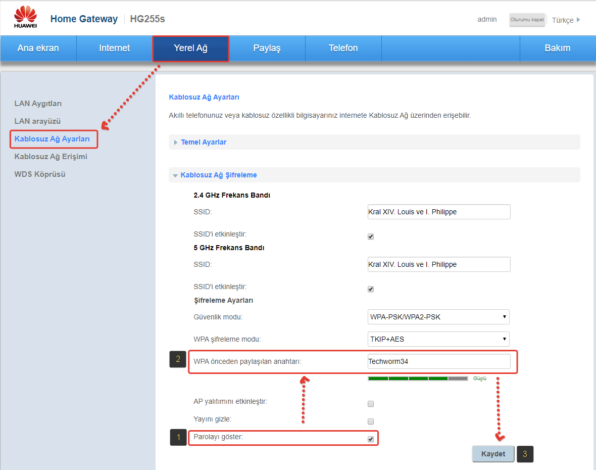 4- Açılan sayfada (ana ekran sekmesi kısmında) “Yerel Ağ” yazan alanı seçin ve buradan “Kablosuz Ağ Ayarları” sekmesini klikleyin. Gelen sayfada “Parola” yazan kısım sizin halin hazırda kullandığınız wifi şifresidir. Şifre değiştirme işlemini burada yapacağız. Öncelikle karmaşık bir şifre belirlemenizde fayda var. Çok basit şifrelerin başkaları tarafından tahmin edilme veya ağınıza bağlanmak isteyen kötü niyetli hackerlar tarafından kırılma ihtimali her zaman bulunduğunu unutmayın. Şifreniz harf ve rakam içerek şekilde olmasına özen gösterin. Örneğin: Techworm34 gibi. Şifreyi yazarken hatalı girmemek için aşağıdaki gibi “Parolayı Göster” seçeneğini seçili hale getiriyoruz. Böylece hem parola kısmında eski şifre görünür hale gelecek hemde buraya gireceğimiz yeni şifreyi görerek girmemizi sağlayacaktır.