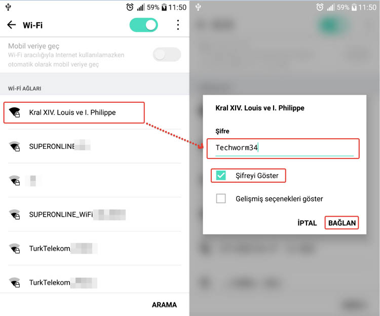 Ardından tekrar “Wifi Adımızın” üzerini klikliyoruz ve yeni belirlediğimiz şifreyi giriyoruz. İşlem telefon ve tabletlerde kısaca bu şekilde.