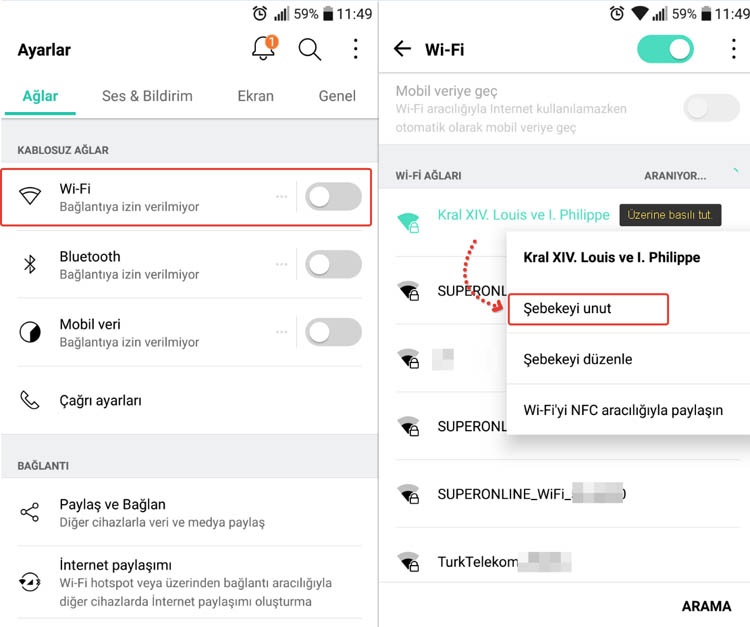 Örneğin; LG G5 Telefonda Ayarlar > Wi-fi sekmesine geliyoruz. Wifi sekmesini klikledikten sonra “Wifi Adımızın” üzerine gelip basılıp tutuyoruz ve “Şebekeyi (Ağı) Unut” diyoruz.
