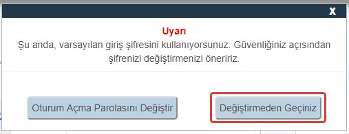 3- Oturum aç dediğinizde karşınıza aşağıdaki gibi “Uyarı. Şu anda, varsayılan giriş şifresini kullanıyorsunuz. Güvenliğiniz açısından şifrenizi değiştirmenizi öneririz.” bilgisi gelecektir. Bireysel olarak (evde vs. felan) modem kullanıyorsanız bu oturum açma şifresini değiştirmenize hiç gerek yok. Eğer olur da değiştirirseniz bu giriş sayfasına geldiğinizde oluşturduğunuz yeni şifreyi girmeniz gerecek. Neyse konumuz wifi şifresi değiştirme olduğundan, değiştirmeden geçiniz seçeneğini seçiniz.