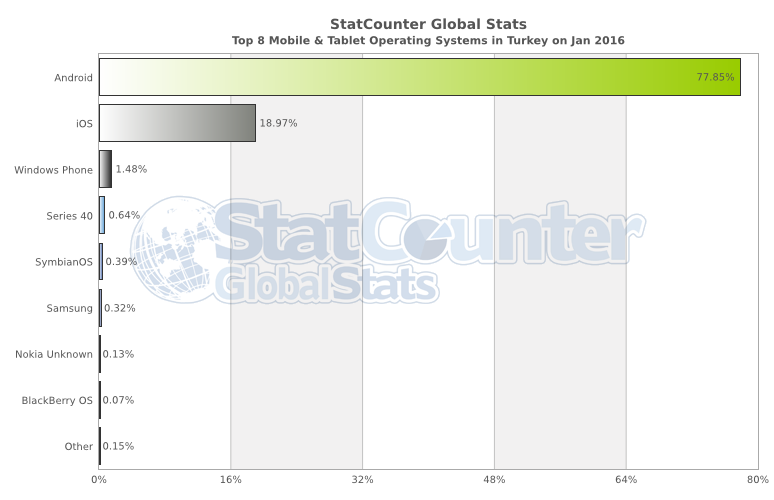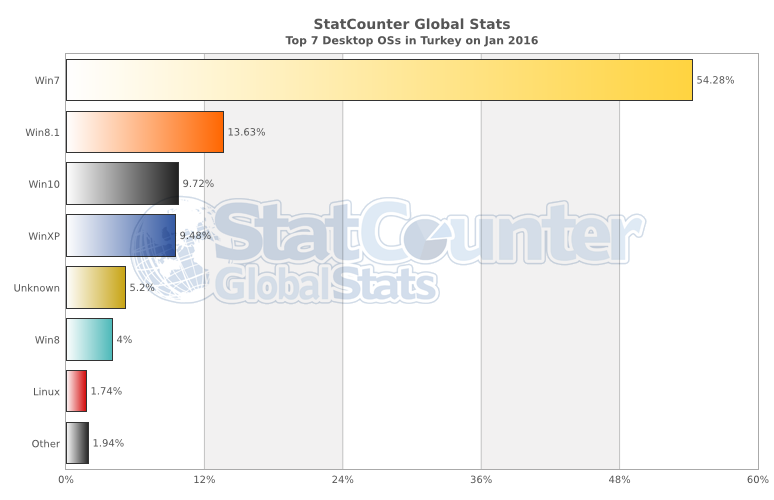 Bilgisayarlara baktığımızda Windows 7 %44’lük orana sahip hemen ardından Windows 7: %54.28, Windows 8.1: %13.63, Windows 10: %9.72, Windows XP: %9.48, Windows 8: %4, Linux: %1.74 oranında. Windows neredeyse Türkiye’de %90’lık bir alana hakim durumda diyebiliriz. Unknown olan %5.2 ise sanırım Mac OS.