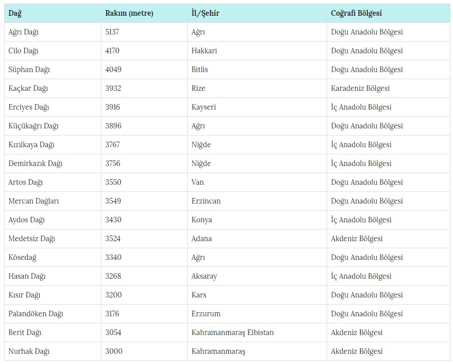 Bu maddede Türkiye’deki en yüksek dağlar, deniz seviyesinden yüksekliklerine göre sıralanmışlardır.