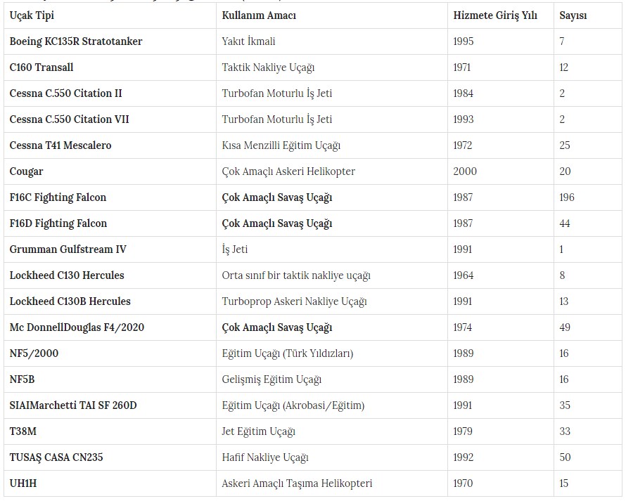 Aşağıda Hava Kuvvetleri Komutanlığı Resmi Web Sitesinden alınan bilgiler bulunmaktadır. Türk Hava Kuvvetleri, envanterinde ki Uçak ve Helikopterler.