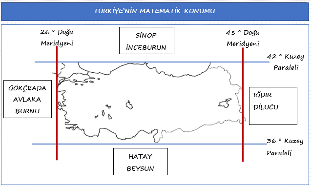 Türkiye matematik konum açısından 26 – 45 doğu meridyenleri ve 36 – 42 kuzey enlemleri arasında yer almaktadır. Türkiye’nin matematik konumu bize ülkemizin Dünya üzerindeki yerini gösterir. Aynı zamanda matematik konumun iklim, yerel saat farkı gibi konularla da doğrudan ilgisi vardır.