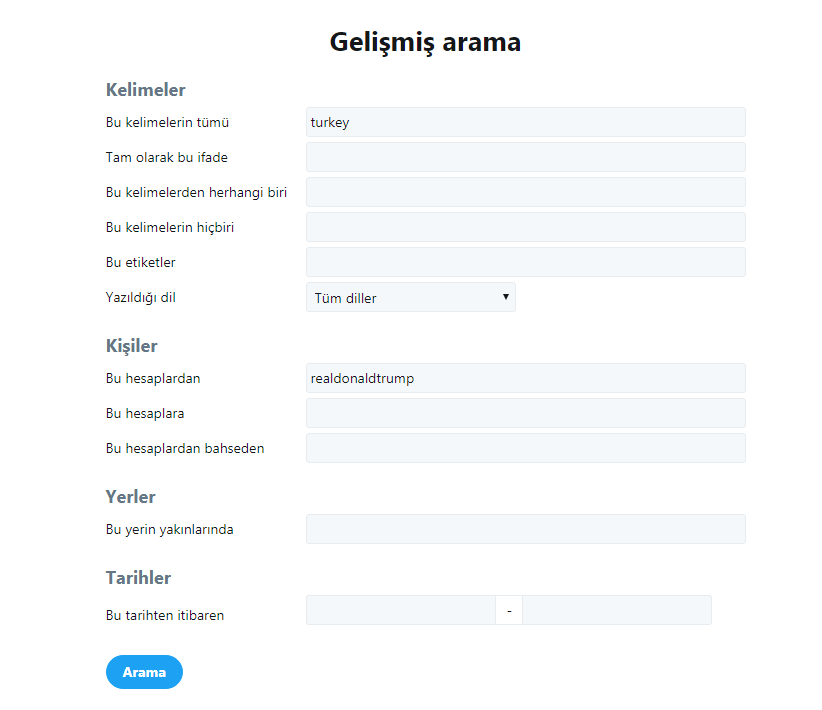 Arama dediğimde Donald Trump‘ın Türkiye hakkında atmış olduğu tüm tweetler gelecektir. Verdiğim bu linki kendi isteğiniz doğrultusunda istediğiniz türde aramalar yapabilirsiniz.