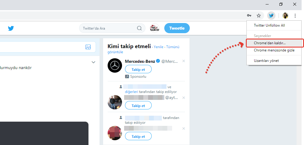 5- Son olarak tekrar tarayıcının sağ üsttünde Twitter ikonuna klikliyoruz ve iki-üç kez gelen uyarı tamam dedikten sonra takip ettiğimiz hesaplar sayfasını açıp hızlı bir şekilde tek tek takipten düşecektir. Bu işlem takip ettiğiniz hesaplara göre değişmekle birlikte 5-10 dk sürebilecektir. İşlem yapılan sayfayı kapatmayın. Bir sorun çıktığında işlemi tekrarlayabilirsiniz.