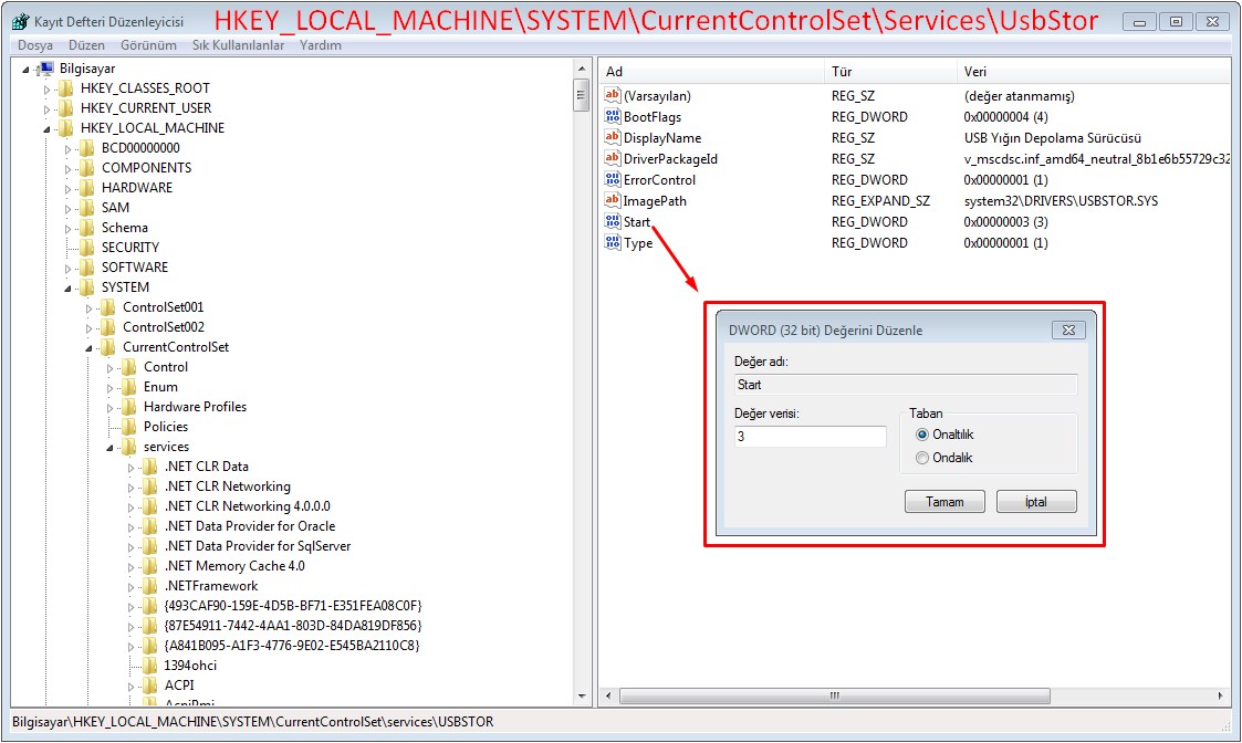 3- Başlat – Çalıştır’dan Regedit ‘i çalıştırın, HKEY_LOCAL_MACHINE\SYSTEM\CurrentControlSet\Services\UsbStor’u sağ klikleyip değiştir dedikten sonra değeri 3, tabanı 16 yapın.