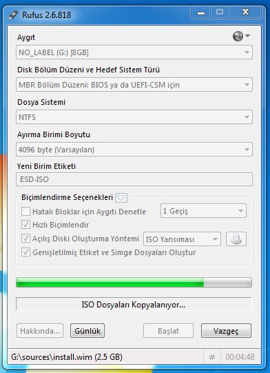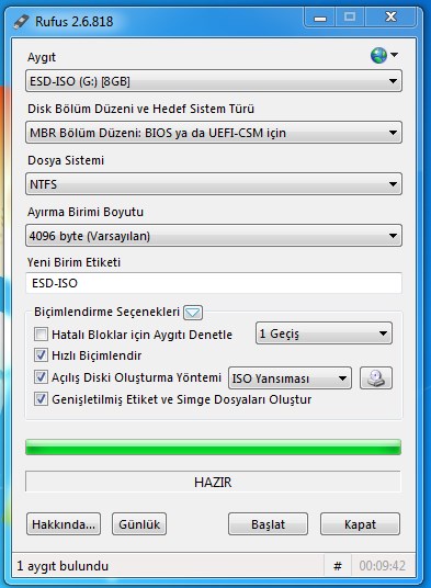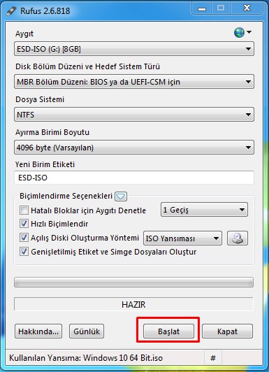 4- Başlat deyip Windows 10’u USB Belleğimize yazdıralım.