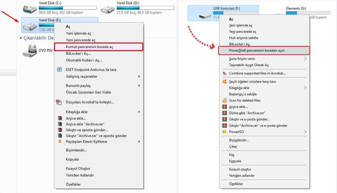 USB Belleğinizi bilgisayarınıza taktığınızda içi dolu olduğu halde boş gösteriyorsa panik etmenize gerek yok. Bu sorunu basit 1-2 adımla çözebiliriz. Öncelikle bilgisayara USB Belleğinizi (Flash Diski) takın üzerine gelip bir parmağınız “SHİFT Tuşuna” basılı iken fare ile SAĞ KLİK yaptığınızda açılan paneldeki “Komut Penceresini Burada Aç” veya “PowerShell penceresini burada açın” seçeneğini seçin.