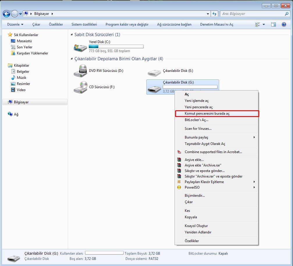 1- USB Belleğini bilgisayarak takın. Taktıktan sonra USB Sürücünüzün üzerine fare ikonu ile geldiğinizde bir parmağınız SHİFT tuşuna basılı iken fare ile SAĞ KLİK yapın. Açılan panelde KOMUT PENCERESİNİ BURADA AÇ veya POWERSHELL PENCERESİNİ BURADA AÇIN seçeneğini seçin.