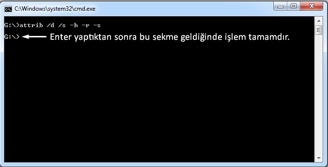 2- Bu işlemi yaptıktan sonra siyah veya mavi bir ekran açılacaktır. Açılan siyah ekrana attrib /d /s -h -r -s kodunu kopyalayıp veya yazıp entera basın. Siyah ekranda yanıp sönen imlec USB Belleğinizdeki bilgilere göre 5 saniye ile 30 saniye sonra durduğunda işleminiz tamamdır. Bilgileriniz kurtarılmıştır.
