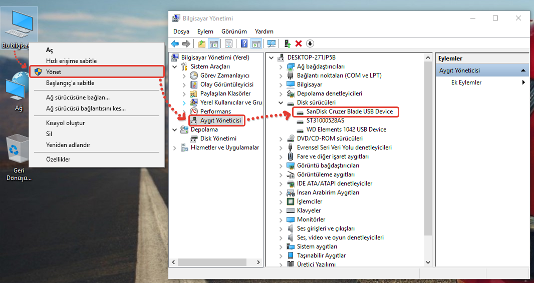 1- Bunun için öncelikle masaüstünden bilgisayarımın üzerini sağ klikleyerek Yönet diyoruz. Açılan pencereden Aygıt Yöneticisini seçtikten sonra sağda gelen kısımdan USB Belleğimizi buluyoruz.