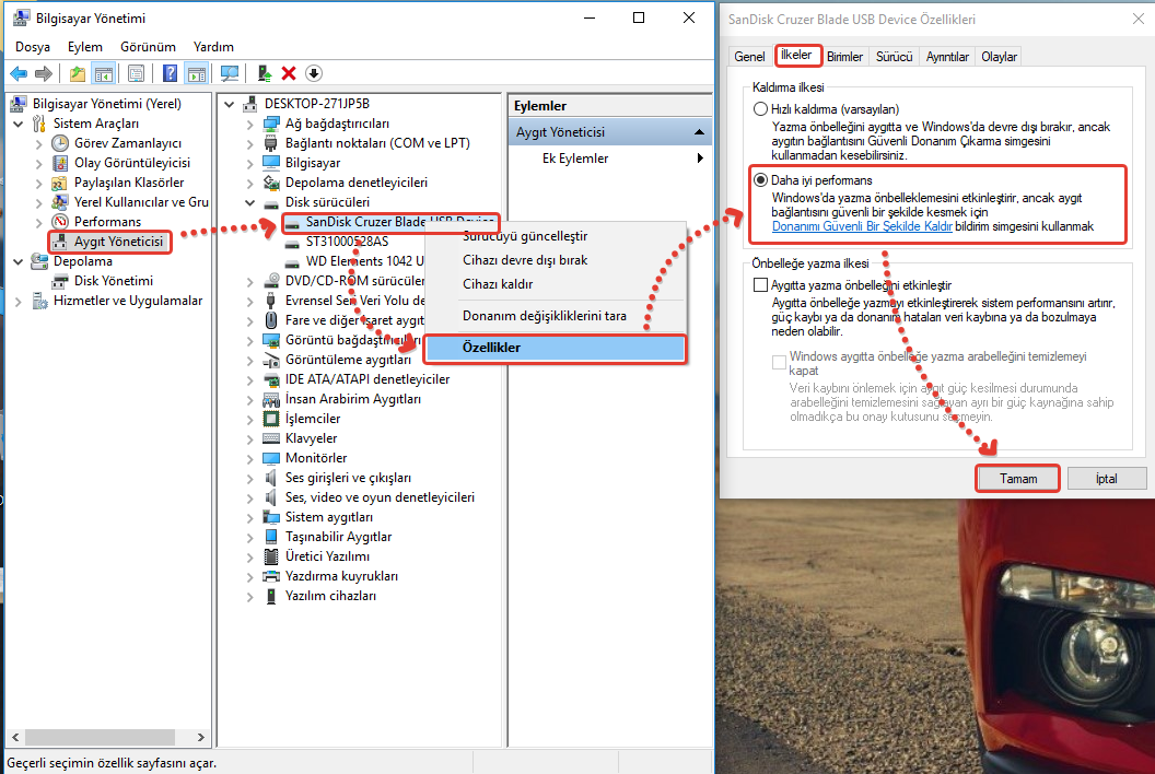 2- Daha sonra USB Belleğimizin üzerini sağ klikleyerek Özellikler diyoruz.Açılan panelden “İlkeler” sekmesine klikleyip ve “Daha İyi Performans” seçeneğini seçip “Tamam” diyoruz ve pencereyi kapatıyoruz.