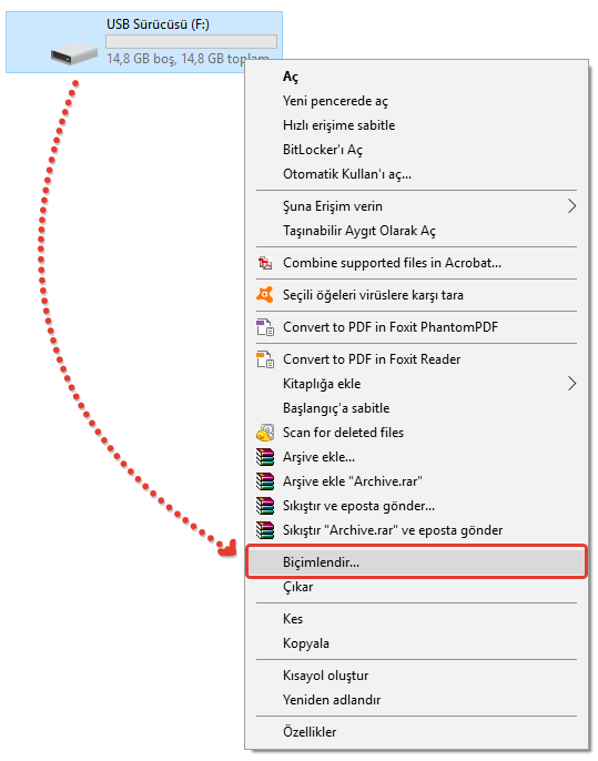 3- Artık USB belleğimiz NTFS dosya sistemine çevirebiliriz. Masaüstünden Bilgisayarım’a girerek USB Belleğimizin üzerini sağ klikleyerek biçimlendir diyoruz.