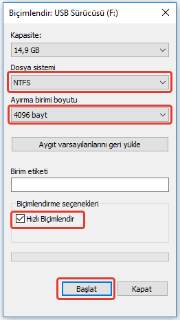 4- Biçimlendir dedikten sonra dosya sistemini NTFS, ayırma birim boyutunu 4096 bayt yaptıktan sonra hızlı biçimlendir kutusunu seçili hale getirip “başlat” diyoruz.
