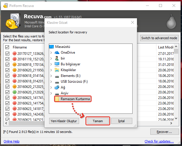 9- Recover dediğimizde karşımıza aşağıdaki gibi bir pencere çıkacaktır. Hemen masaüstünde önceden belirlediğimiz boş klasörü seçip “TAMAM” diyoruz.