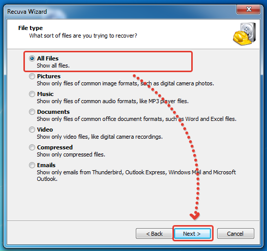 4- Kurtaracağımız verilerin tamamının geri gelmesi için All Files diyoruz ve ardından Next diyelim.