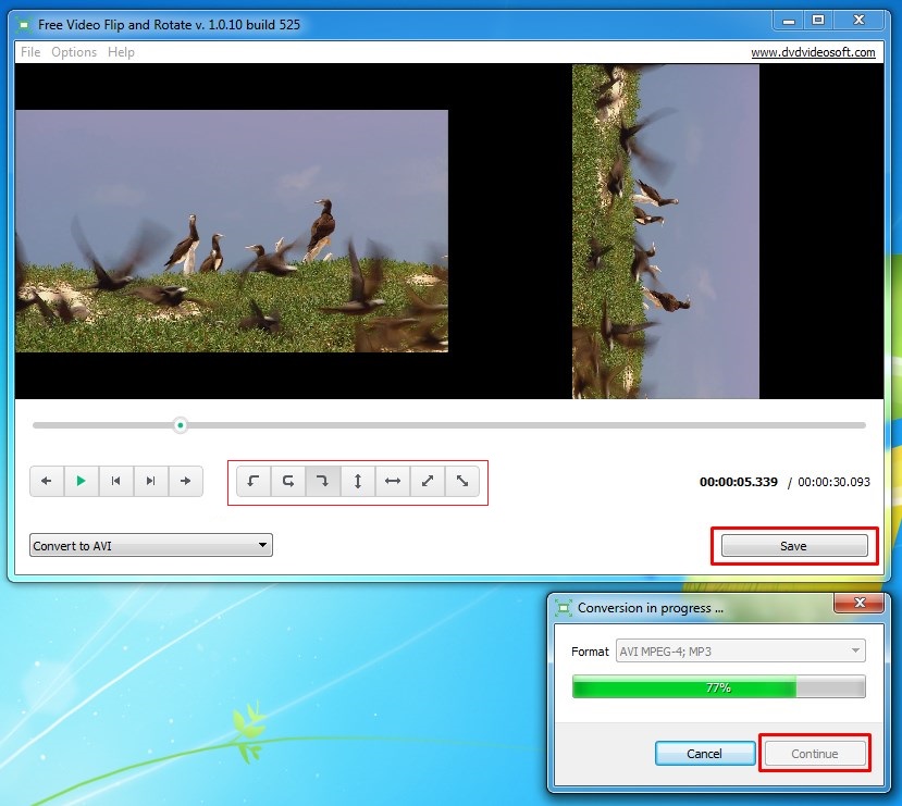 3- Taşıma işlemi bittiktek sonra altta kırmızı ile gösterdiğim alanda dilerseniz sağa sola veya dilerseniz başka bir doğrultuda (terz-aşağı-yukarı) klikleyin. Play yaptığınızda sağda izlyeceğiniz video dönüşmüş hali olacaktır. İşlem tamamsa SAVE‘yi seçin ve ardından CONTINUE dedikten sonra videonuz kısa bir sürede dönüştürülecektir.