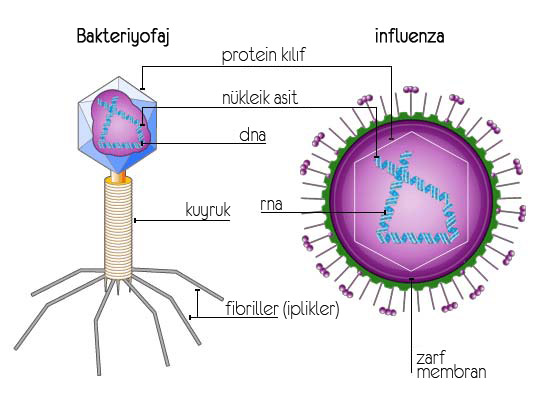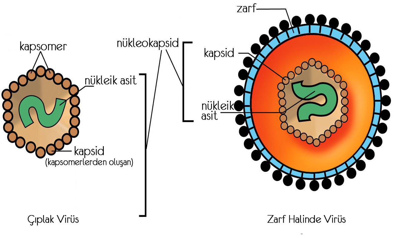 Nükleik Asit: Virüsler DNA veya RNA’ya sahiptir. Virüs genleri çizgi şeklinde veya dairesel, tek veya parçalı, tek veya çift iplikçik şeklinde olabilir.