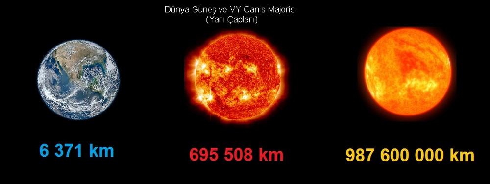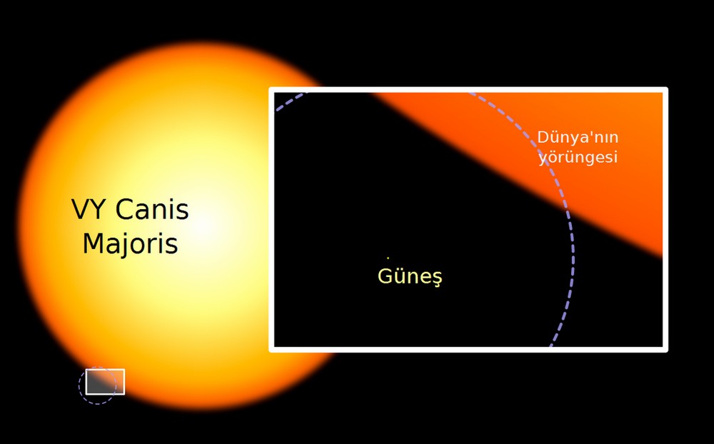 VY Canis Majoris’in içini doldurmak için 7.000.000.000.000.000.000.000.000.000.000.000 (7 Desilyon)’dan fazla Dünya gerekir. VY CMa’nın çapı yaklaşık 3.063.500.000 kilometredir. VY CMa, Güneş’in yerine konulunca Jüpiter’in yörüngesine ulaşan boyutuyla VV Cephei A’dan %15 daha büyüktür. Eğer saatte 980 km hızla giden bir uzay mekiği VY Canis Majoris’in etrafında bir tur atmak isteseydi bu tur yaklaşık 1100 yıl sürerdi. Eğer dünyayı 1 cm çapında var sayarsak, VY Canis Majoris yıldızının çapı 6,5 km büyüklüğünde olurdu. Eğer Dünya’dan VY CMa’ya 2000 KM hız yapan bir uzay mekiği ile gitmek istesek bu yaklaşık 10 bin trilyon yıl sürerdi.