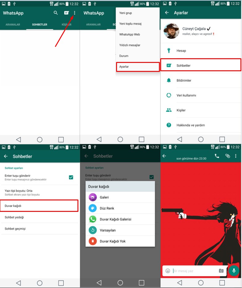 Herkese Merhaba. Bu yazımızda sizlere WhastApp sohbet ekranında bulunan duvar kağıdını nasıl değiştireceğiniz konusunda bilgi vermeye çalışacağım. Yapacağımız işlem olabiliğince basit. İşleminizi gerçekleştirdikten sonra seçtiğiniz duvar kağıdına göre aşağıdaki gibi olacaktır.