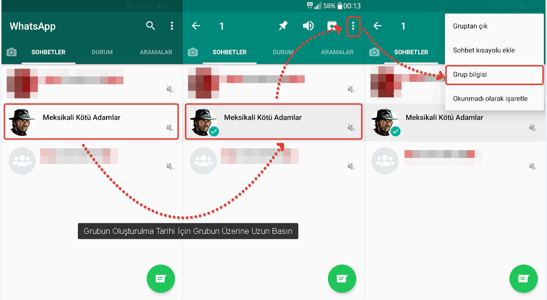 Bir WhatsApp grubunun ne zaman hangi tarih ve saatte kurulduğunu basit bir şekilde öğrenebilirsiniz. Bunun için WhatsApp arayüzünden grubun üzerine basılı tutup sağ üstteki dikey üç nokta logosuna klikleyip açılan panelde grup bilgisi sekmesini seçiyoruz.