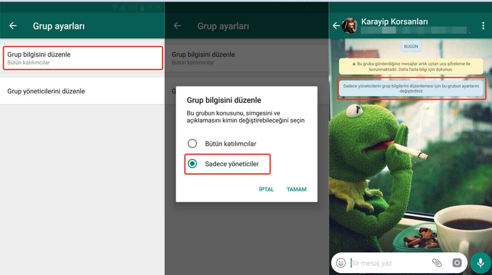 2- Bu kısımda ise “Grup Bilgisini Düzenle” kısmını seçerek “Bütün Katılımcılar” yerine “Sadece Yöneticiler” seçeneğini aktif hale getirin ve “Tamam” diyelim. İşlemimiz tamamlanmıştır. Sohbet ekranında “Sadece yöneticilerin grup bilgisini düzenlemesi için bu grubun ayarlarını değiştirdiniz” uyarısı gelecektir.