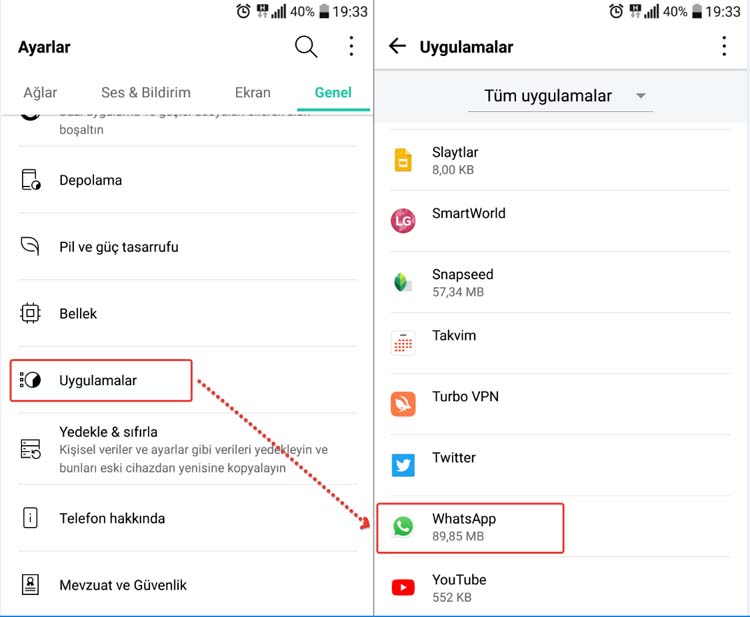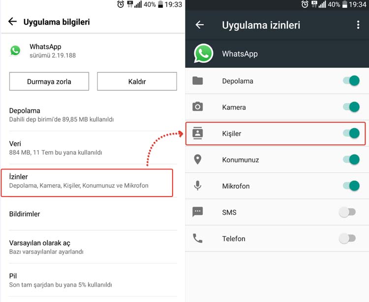 1- Öncelikle Ayarlar > Uygulamalar > Whatsapp > Uygulama İzinleri seçeneğine giriş yaparak Kişilerim seçeneğini aktif hale getirin.