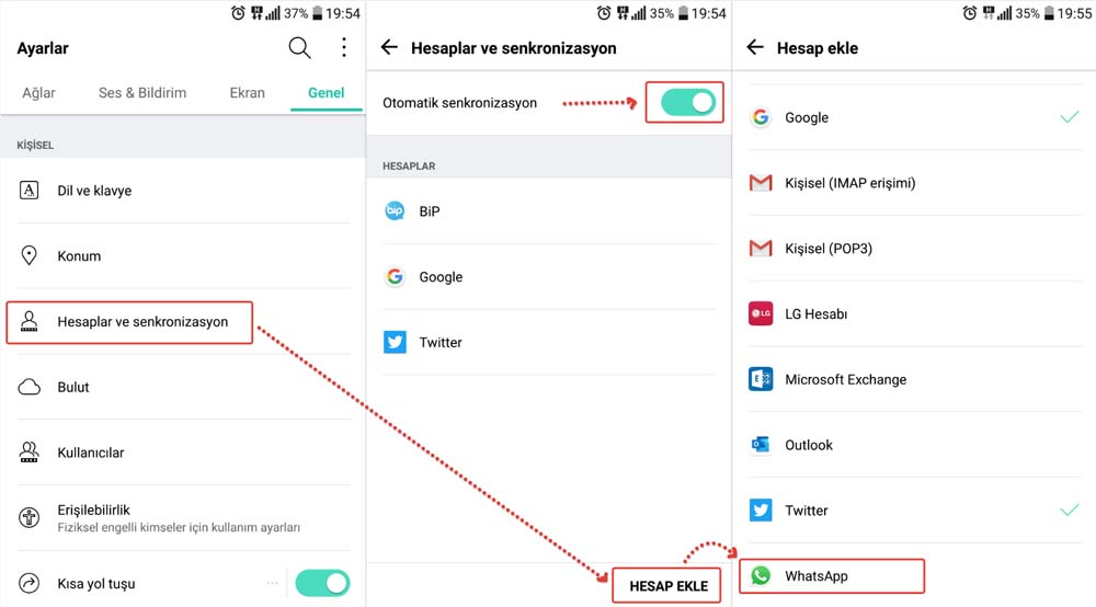 2- Telefonunuzun Ayarlar‘ını açın, sonrasında Kullanıcılar ve Hesaplar (veya Hesaplar ve Senkronizasyon) kısmına gelerek Hesap Ekle diyelim. Açılan pencereden WhatsApp‘ı klikleyelerek senkronizasyon listesine ekleyelim ve tekrar Kullanıcılar ve Hesaplar (veya Hesaplar ve Senkronizasyon) kısmına gelelim.