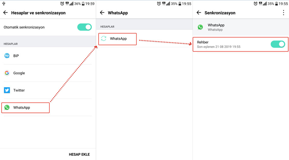 3- Kullanıcılar ve Hesaplar (veya Hesaplar ve Senkronizasyon) kısmına geldiğimizde WhatsApp logosu görünecek ve burayı klikleyip Rehber kısmını aktif hale getiriyoruz. İşleminiz tamamlanmıştır. Bundan sonra WhatsApp kısmında numaralar yerine telefon rehberinizdeki isimler görünecektir.