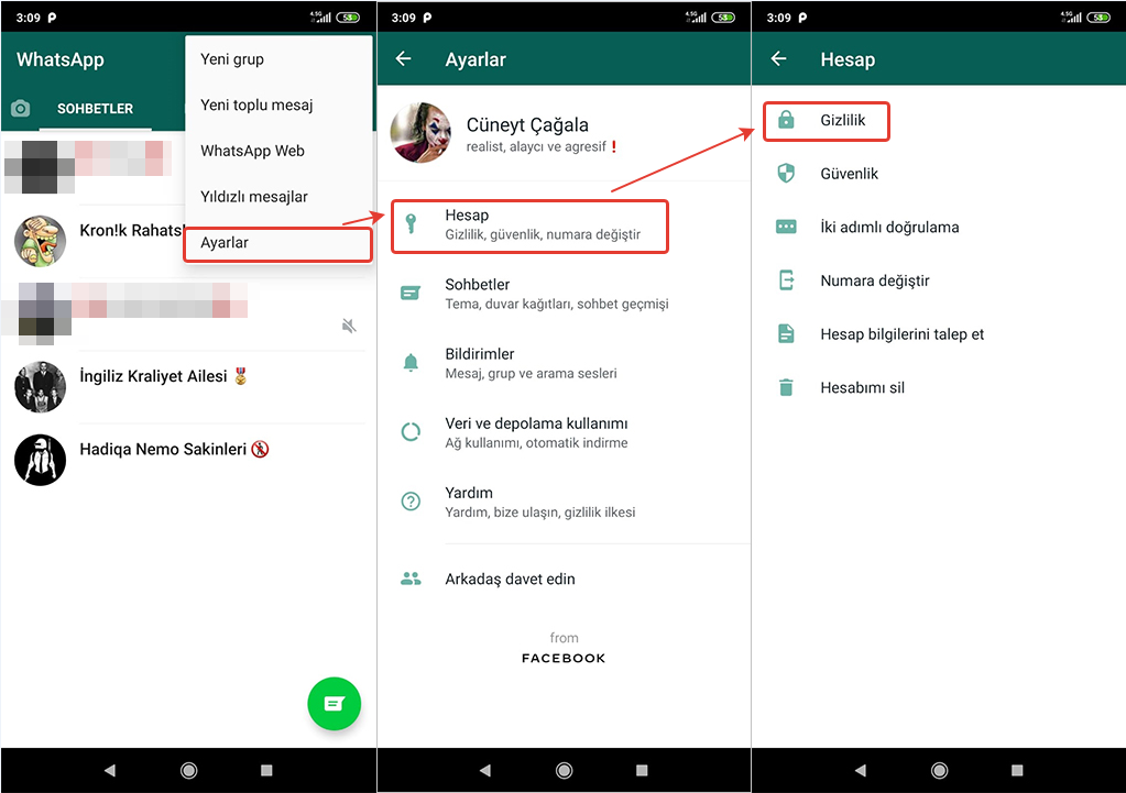 Şimdi telefon parmak izi kilidinizin aktif olduğunu varsayarak “WhatsApp Parmak İzi Kilidi Koyma ve Kaldırma” işlemine geçelim. İlk olarak WhatsApp uygulamamızı açalım. Buradan sağ üstteki üç nokta simgesine klikleyelim ve açılan panelden “Ayarlar” diyelim. Buradan Hesap, ardından Gizlilik sekmesini seçelim.