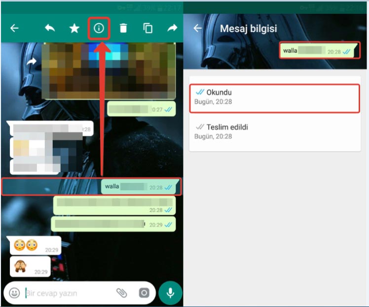 Bunun için hangi mesajın ne zaman okunduğunu görmek için üzerine uzun klikleyin ve üstte açılan ünlem logosunu seçin. Açılan pencerede ilgili mesaj ile ilgili okunma zaman bilgileri çıkacaktır.