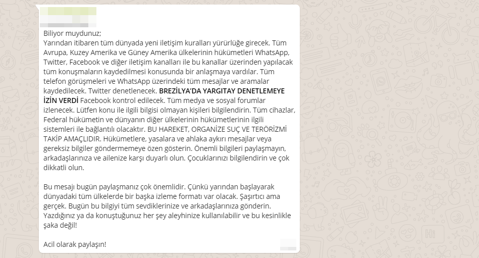Yarından itibaren tüm dünyada yeni iletişim kuralları yürürlüğe girecek. Tüm Avrupa, Kuzey Amerika ve Güney Amerika ülkelerinin hükümetleri WhatsApp, Twitter, Facebook ve diğer iletişim kanalları ile bu kanallar üzerinden yapılacak tüm konuşmaların kaydedilmesi konusunda bir anlaşmaya vardılar. Tüm telefon görüşmeleri ve WhatsApp üzerindeki tüm mesajlar ve aramalar kaydedilecek. Twitter denetlenecek. BREZİLYA’DA YARGITAY DENETLEMEYE İZİN VERDİ Facebook kontrol edilecek. Tüm medya ve sosyal forumlar izlenecek. Lütfen konu ile ilgili bilgisi olmayan kişileri bilgilendirin. Tüm cihazlar, Federal hükümetin ve dünyanın diğer ülkelerinin hükümetlerinin ilgili sistemleri ile bağlantılı olacaktır. BU HAREKET, ORGANİZE SUÇ VE TERÖRİZMİ TAKİP AMAÇLIDIR. Hükümetlere, yasalara ve ahlaka aykırı mesajlar veya gereksiz bilgiler göndermemeye özen gösterin. Önemli bilgileri paylaşmayın, arkadaşlarınıza ve ailenize karşı duyarlı olun. Çocuklarınızı bilgilendirin ve çok dikkatli olun.