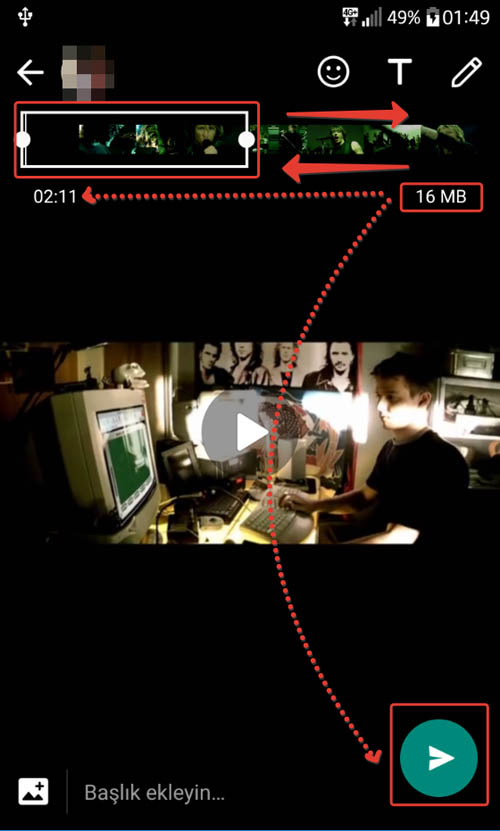Örneğin yaklaşık 24 MB olan Bon Jovi’nin İt’s My Life adlı video klibini WhatsApp ile bir kişiye göndermek istediğimde otomatik olarak sadece 16 MB’lık kısmını gönderecektir. Bu yaklaşık (video özelliğine göre değişebilir) 2.12 dakikasına denk gelmektedir. Ne yaparsam yapayım bu kapasiteden farklı göndermeyecektir. Dilerseniz toplam 16 MB’a denk gelen bir kısmı beyaz kare içindeki alanı hareket ettirmek suretiyle karşı tarafa gönderebilirsiniz.