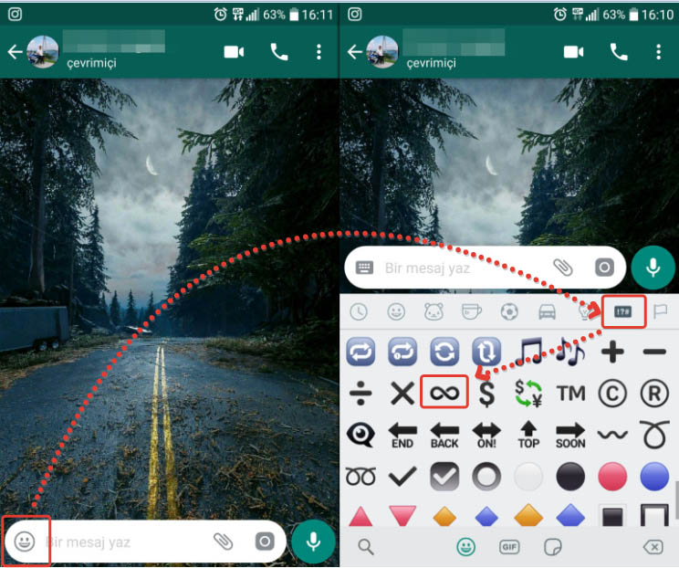 Şimdi cep telefonunuzun whastapp sohbet ekranında bu sonsuzluk işaretini nasıl yapabiliriz sorusunun cevabına geçelim. Sohbet penceresi ekranında sol altta emoji simgesine klikleyelim ve açılan panelde en sondaki simgeler (!?#) kısmını seçelim. Aşağıya kaydırarak “sonsuzluk işaretini” bulalım ve seçelim. işlemimiz kısaca bu kadar.