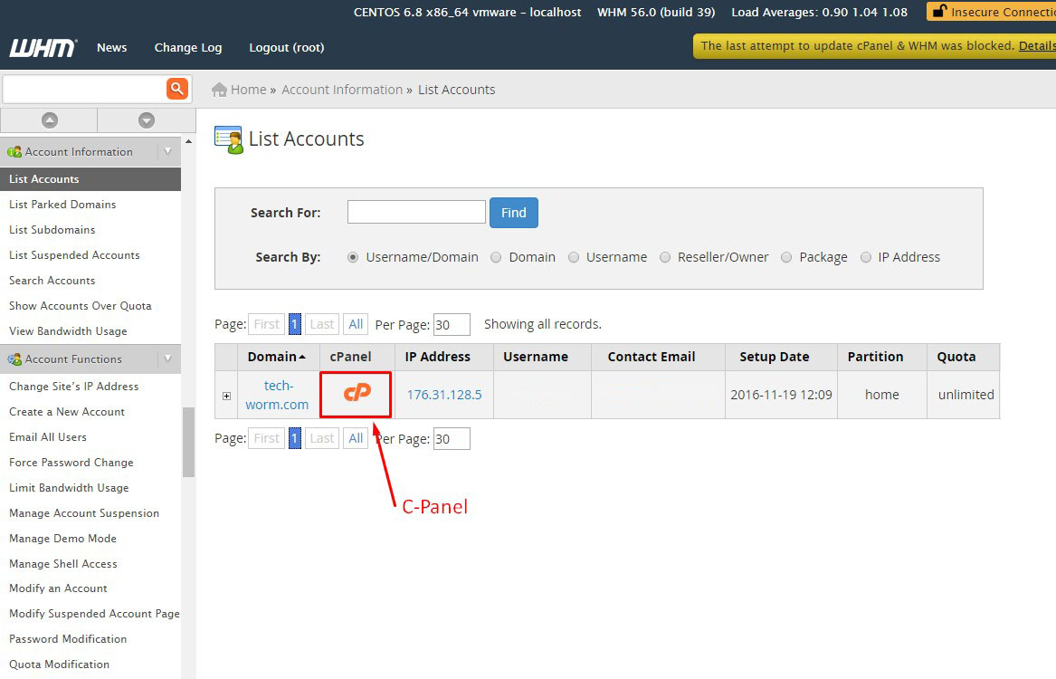 VHM Panelin üzerinden doğrudan C-Panel Ekranına geçiş yapılabilir. Bunun için VHM Panelinde Account Information >>> List Accounts kısmı kliklendiğinde açılan pencerede VHM Panele bağlı Account (Web Siteleri) sıralanır. Hangi sitenin C-Paneline erişim sağlanmak isteniyorsa ona ait CP logosu kliklenir. (İşlem aşağıdaki gibidir)