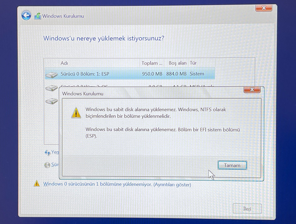 Windows 0 Sürücüsünün 3 Bölümüne Yüklenemez! (Windows Bu Sabit Disk Alanına Yüklenemez Windows NTFS Olarak Biçimlendirilen Bir Bölüme Yüklenmelidir.) Windows Bu Sabit Disk Alanına Yüklenemez. Bölüm bir EFI Sistem Bölümü (ESP).