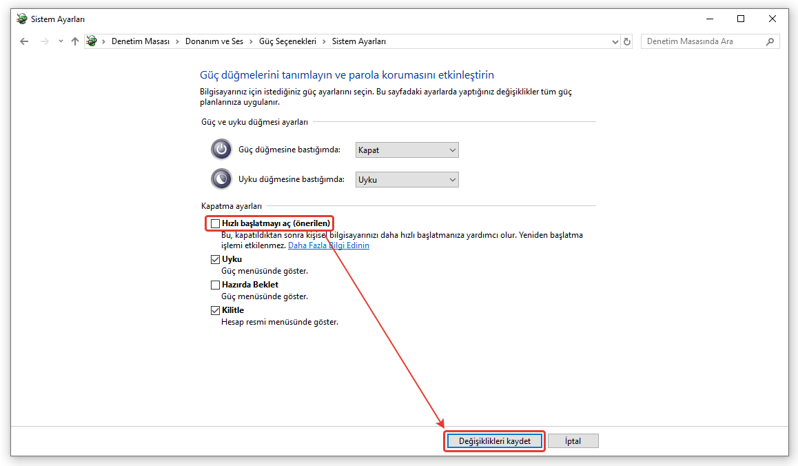 Denetim Masası | Sistem ve Güvenlik | Güç Seçenekleri Altında (Güç Düğmesi Davranışını Değiştir) | Şu Anda Kullanılmayan Ayarları Değiştir | Hızlı Başlatmayı Aç seçeneğindeki kliği kaldır ve değişiklikleri kaydet diyoruz. Ardından bilgisayarımızı yeniden başlatıp Numlock Tuşunu kontrol edelim.