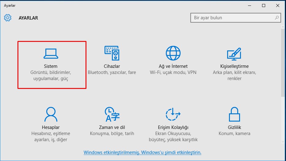 1- Başlat sekmesinde iken Ayarlar diyoruz.