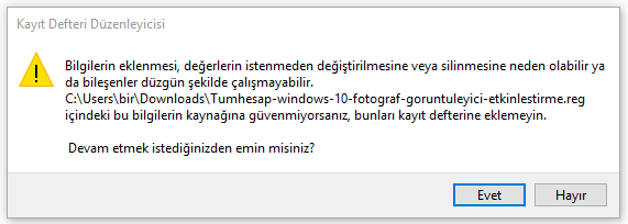 Burada (tıkla) bulunan linkten kayıt defteri dosyasını indirin. Üzerine sağ klikleyip arşivden çıkartın. Ardından fare ile üzerinde çift klikleyip çalıştırın. “Bu uygulamanın cihazınızda değişiklik yapmasına izin vermek istiyor musunuz?” sorusuna “EVET” diyelim. Açılan panelde sorulan “Devam etmek istiyor musunuz?” sorusuna tekrar “EVET” diyoruz.