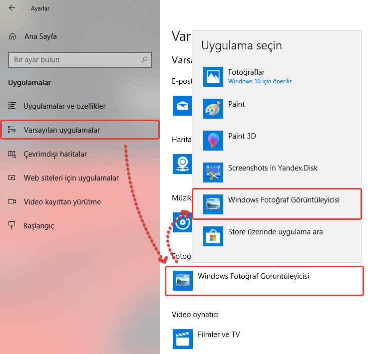 Şimdi Ayarlar > Uygulamalar > Varsayılan Uygulamalar kısmından “Fotoğraf Görüntüleyicisi” sekmesine gelip buradan “Windows Fotoğraf Görüntüleyicisini” seçiyoruz. İşlemimiz tamam. Artık varsayılan olarak fotoğraflarımız/resimlerimiz -bildiğimiz, tanıdığımız- fotoğraf görüntüleyicisi ile açılacak.