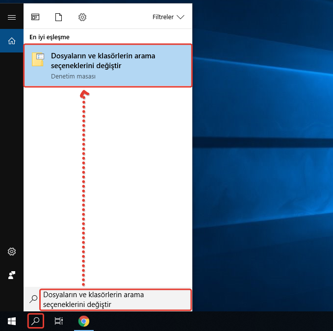 Devamında başlat menüsü yanındaki arama kısmına “Dosyaların ve klasörlerin arama seçeneklerini değiştir” yazın ve karşımıza çıkan seçeneği klikliyoruz.