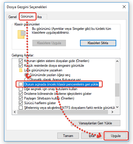 Burada “Görünüm” sekmesi altında bulunan “Oturum açmada önceki klasör pencerelerini geri yükle” seçeneğindeki tiki kaldırıyoruz. (Yanındaki tik işareti olmayacak.) İşlemimiz kısaca bu şekilde.